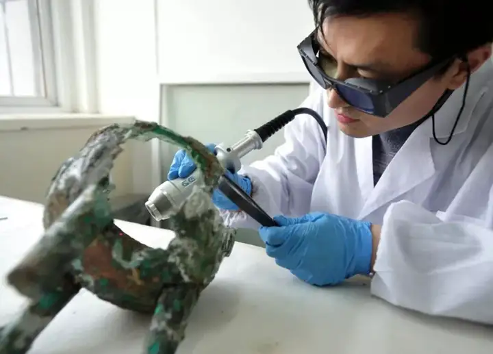 Using a laser cleaning machine to remove corrosion from bronze artifacts
