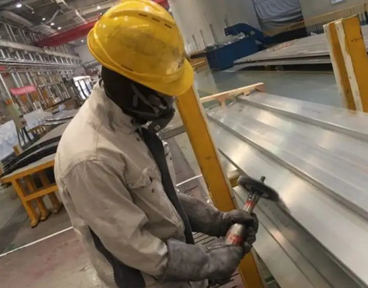 Workers manually clean using hand-held grinding wheels.